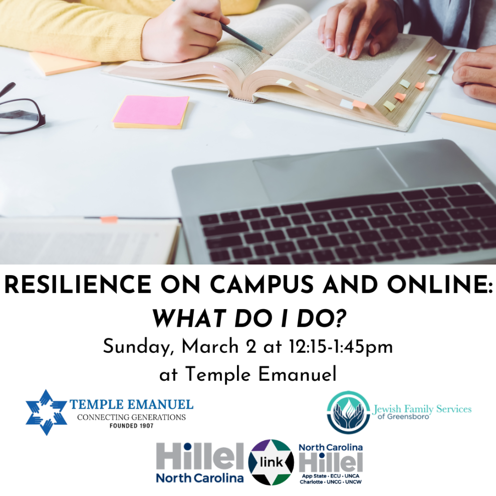 This program will feature representatives from NC Hillel , JFS, and a Licensed Clinical Social Worker from our health care community.ย The program is intended for our community High school Seniors and their parents/caregivers to listen and learn regarding helpful and healthy strategies/coping skills as students transition to college campus life in the current climate of antisemitism.