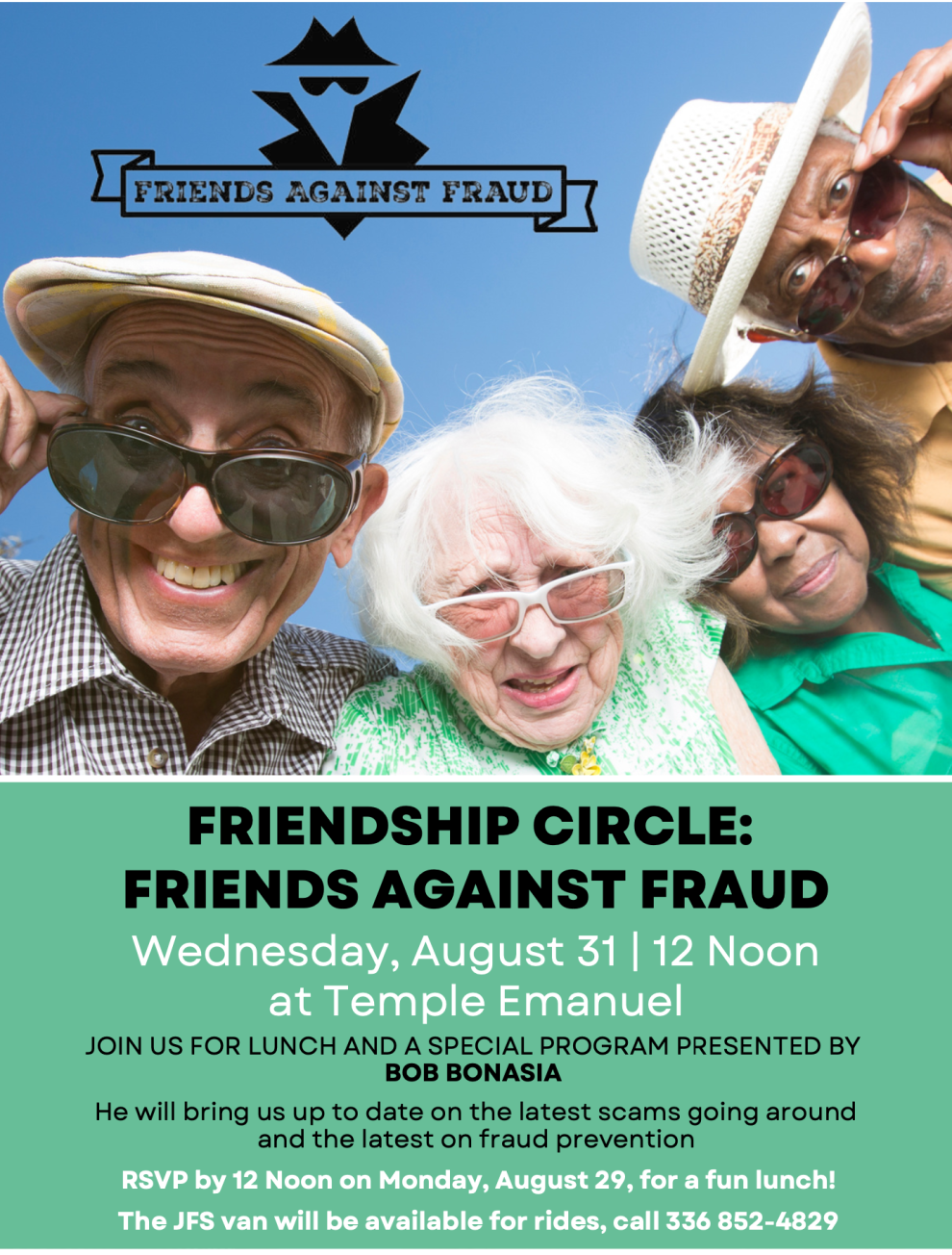 Join the Friendship Circle on Wednesday, August 31 at 12 Noon for a special program presented by Bob Bonasia. He will bring us up to date on the latest scams going around and the latest on fraud prevention.